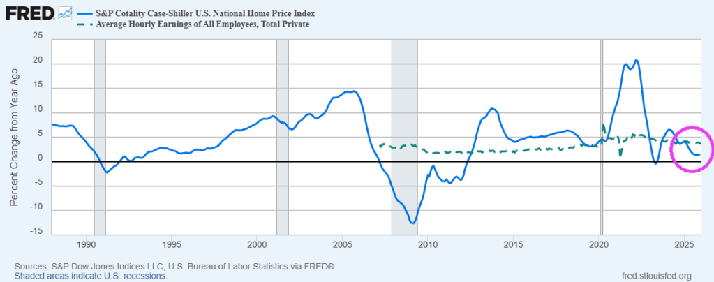 The S&P Cotality Case-Shiller U.S. National Home Price NSA Index posted a 1.3% annual gain (YoY) for December 2025, down from a 1.4% rise in the previous month. Average hourly earnings now at 3.73% YoY, higher than home price growth.