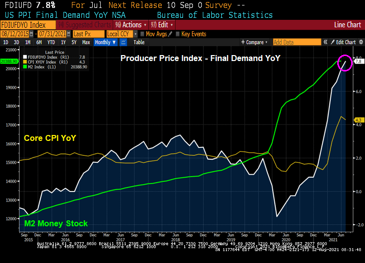 Well, economists were expecting a 7.2% YoY print of the Producer Price Index – Final Demand. But July’s print came in hot … at +7.8% YoY. Compare that with the Core Consumer Price Index YoY of +4.3%.