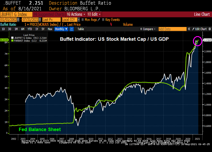 Let’s start with the Buffett Indicator. The ratio of Total Market Capitalization of all US stocks (WCAUUS ) to total nominal GDP of the United States (GDP CUR$ ).
