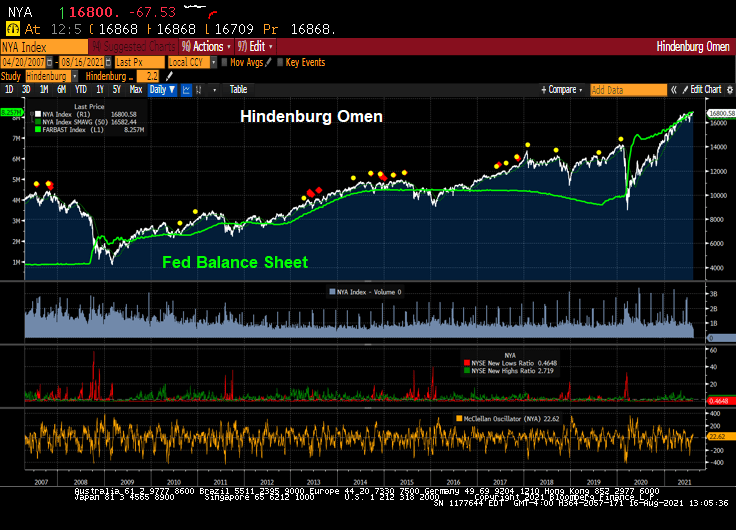 How about The Hindenburg Omen, a technical indicator that was designed to signal the increased probability of a stock market crash. It compares the percentage of new 52-week highs and new 52-week lows in stock prices to a predetermined reference percentage that is supposed to predict the increasing likelihood of a market crash.