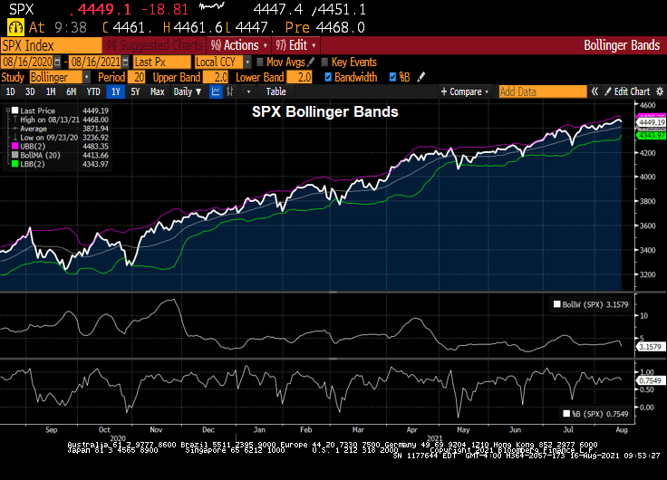 SPX and Bollinger Bands? The SPX index is close to the upper band.