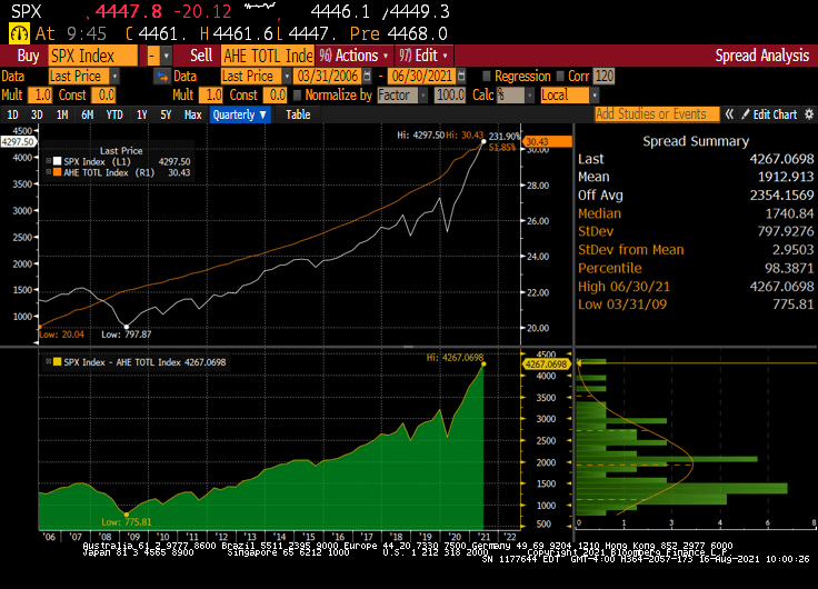 How about gold to Average Hourly Earnings (similar to the Bichler and Nitzan “Power” measure. The spread (bottom chart) sees the S&P 500 index soaring away from average hourly earnings.