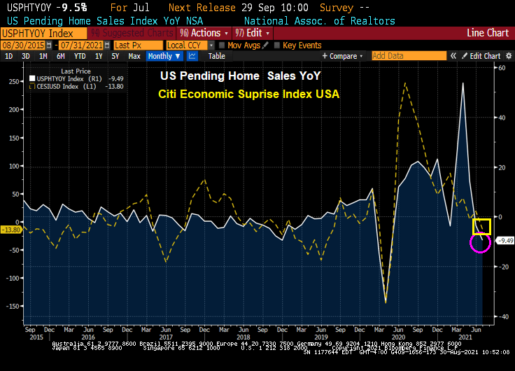 US pending home sales tanked -9.5% YoY in July. Unexpected? Not with the Citi Economic Surprise declining below zero.