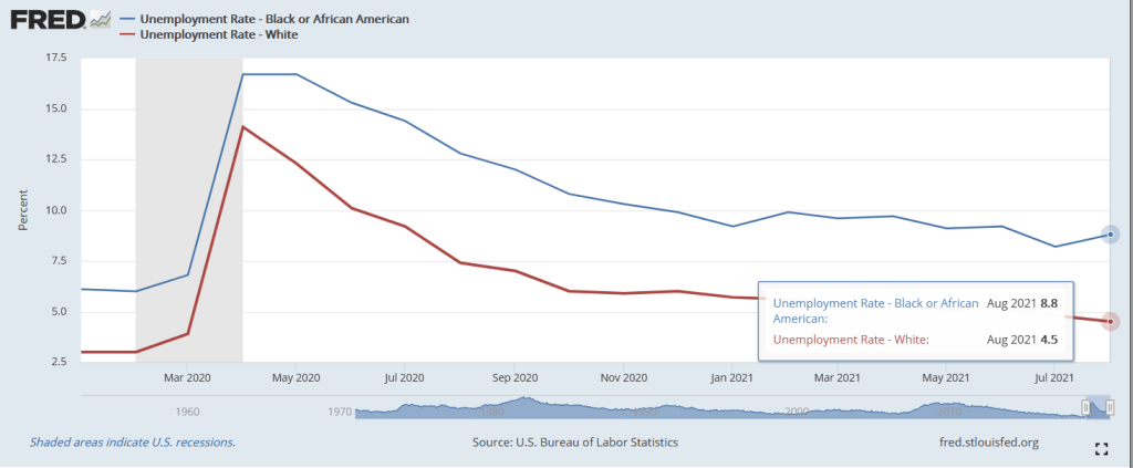 The bad news? Black unemployment rose to 8.8% in August while white unemployment fell to 4.5%. This represents a widening of the employment gap that is higher in August than pre-Covid.