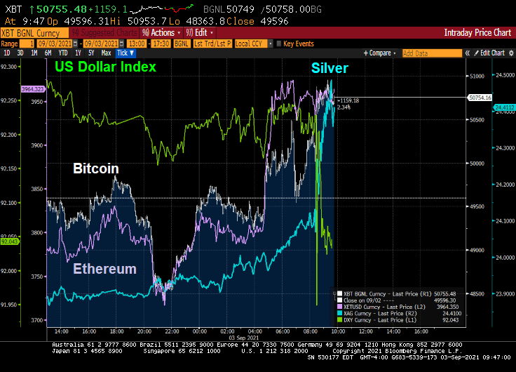 Alternative investments silver, Bitcoin and Ethereum rose on the lousy jobs report as the US Dollar dropped.