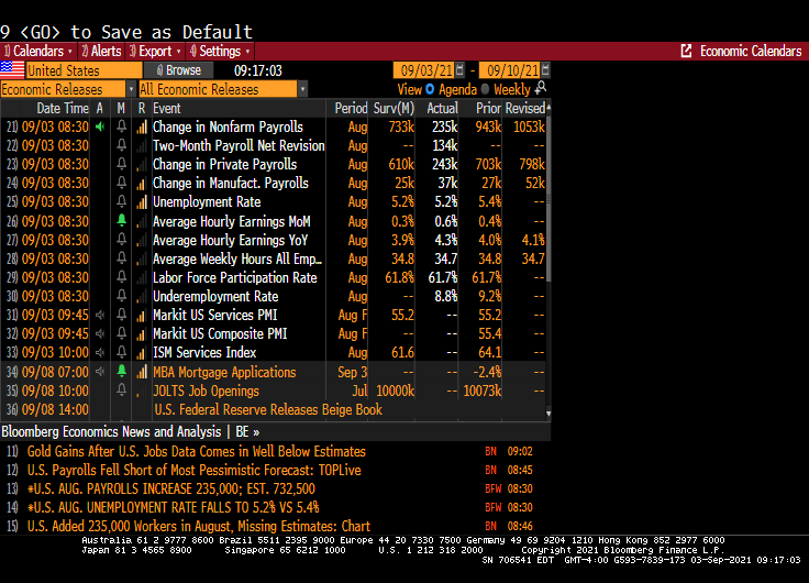 A big miss on the topline job creation number — the establishment survey suggested only 235,000 jobs were created in August, versus expectations for 733,000 — has undercut what little chance there was left of a Fed announcement on tapering later this month. It should make for a very interesting debate among policy makers about forward momentum in the labor market.
