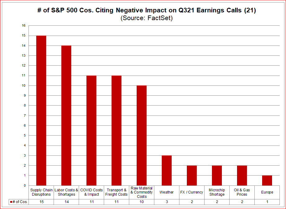 Equity investors so far seem unperturbed. That’s the view of Matt Maley, chief market strategist for Miller Tabak + Co., given that the S&P 500 is just 3.9% lower from its all-time high. However, the mood music could change as the third-quarter reporting season kicks off and corporate executives sound off on supply chain issues and rising input costs, he said.