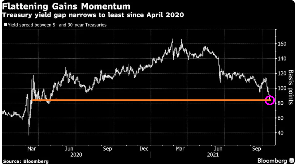 The US Treasury yield curve has flattened to almost pre-Covid levels, signalling fear of inflation. And given our bottlenecked economy that The Fed and Federal government seem not to understand (or care), the flattening signals a wild ride ahead.