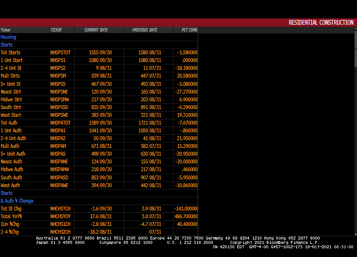 US housing starts slowed in September to at a -1.58% MoM rate. Permits dropped 7.67% MoM.