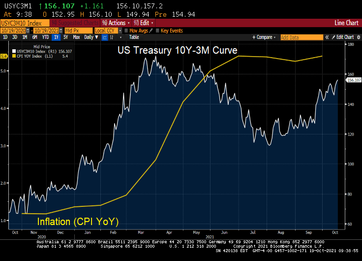 The US Treasury 10Y-3M slope is rising as inflation rises (that inflation curve looks like the ARCTAN function from prepayment modeling!)