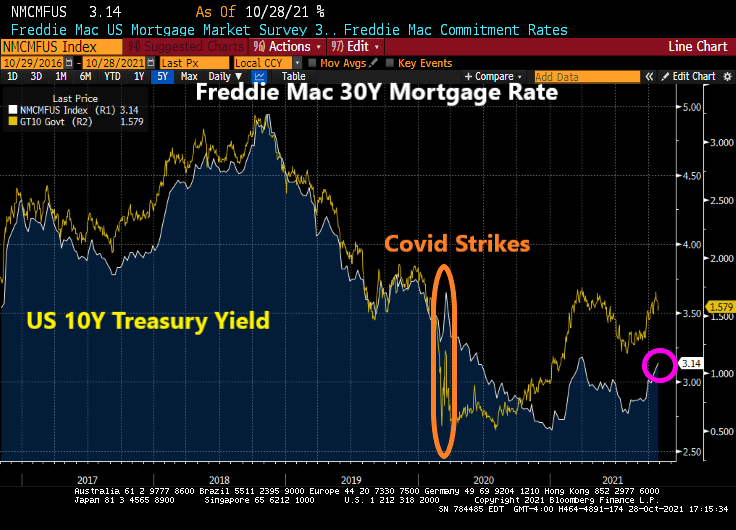 Notice how Freddie’s 30-year loan commitment rate tracked the 10-year Treasury yield … until Covid struck. Then there was a separation of the two rates.
