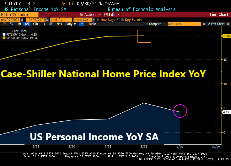Although there was a record jump in wages and salaries, personal income was reported to have dropped -1.04% in September. On a YoY basis, personal income fell to a 4.15% growth rate. Even more disturbing, the Case-Shiller national home price index is still rising at a near 20% pace.