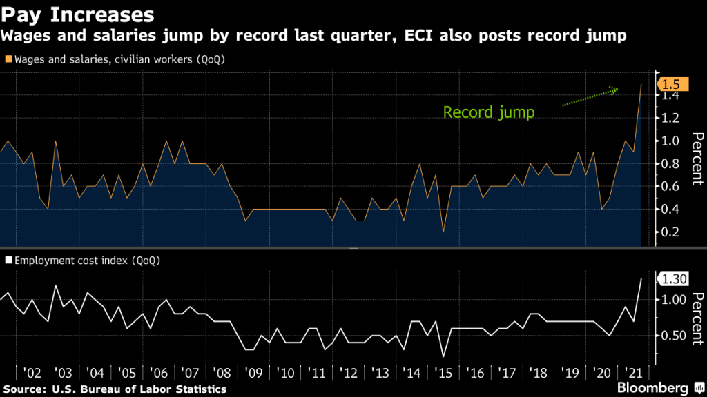 U.S. employment costs rose at the fastest pace on record in the third quarter as companies across a variety of sectors raised wages against a backdrop of labor shortages.
