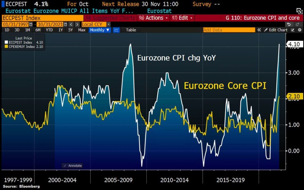 Let’s start Eurozone inflation. It is now sitting a 4.10% YoY. And core inflation is sitting at 2.10% YoY. Inflation is now the highest since 2009 while core inflation is at the highest since 2001.