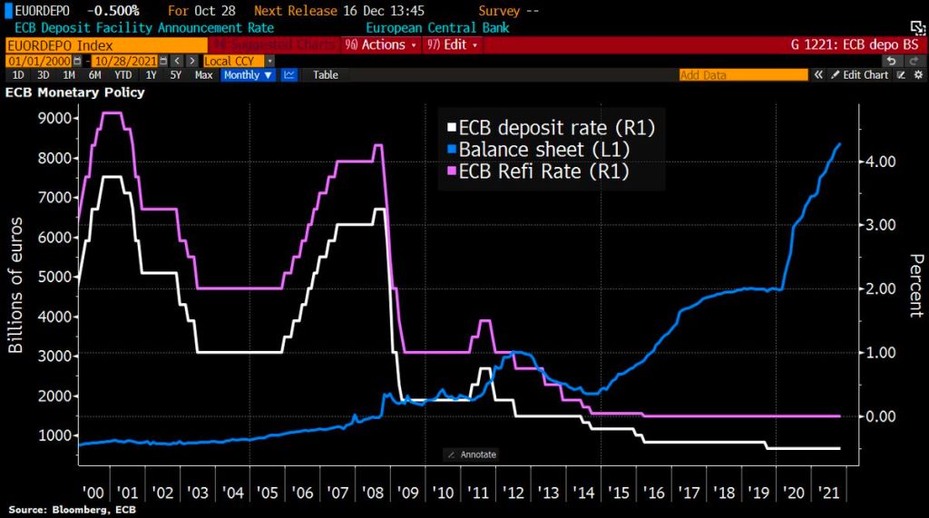 Like the Federal Reserve, the ECB still has its foot on the monetary accelerator pedal despite booming inflation.