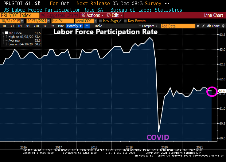 Look at labor force participation both in October and before Covid. After the large decline in LFP, it rose again then leveled-off to near where it is in October 61.6%.