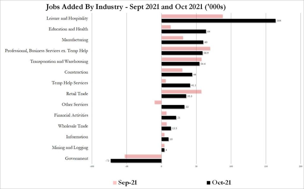 Employment in leisure and hospitality increased by 164,000 in October and has risen by 2.4 million thus far in 2021. Over the month, employment rose by 119,000 in food services and drinking places and by 23,000 in accommodation. Employment in leisure and hospitality is down by 1.4 million, or 8.2 percent, since February 2020.