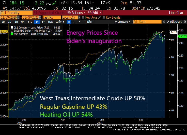 Since Biden’s inauguration, West Texas Intermediate crude prices have soared by 58%, regular gasoline prices have soared by 43% and heating oil has soared by 54%.