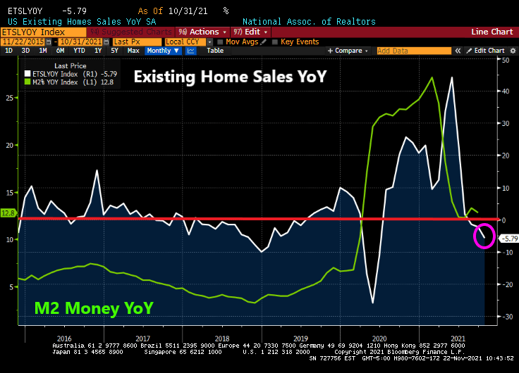 While existing home sales rose 0.8% MoM, they fell -5.79% on a YoY basis as M2 Money slowed.