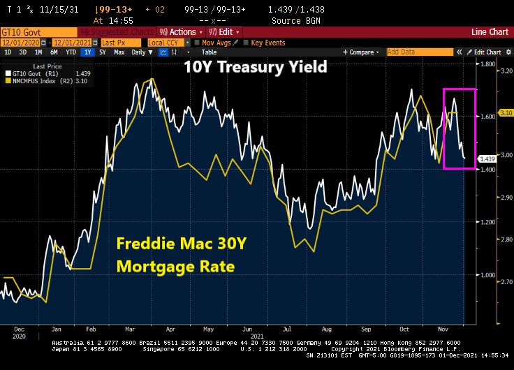 But between Omicron (or as the French say, “Oh! Macron!”) and The Federal Reserve, there is a good chance that mortgage rates will fall this week putting a quick end to refi application plunge.