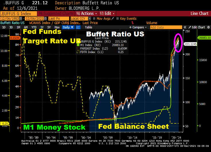 Speaking of cracks, how will the Buffett Ratio US react to a reduction in The Fed’s balance sheet (orange line) and M1 and M2 Money stock? Given that the Fed Funds target rate is WAY below where it should be (according to the Taylor Rule).