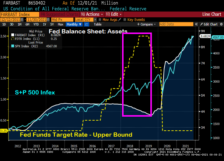 We will soon find out if The Federal Reserve will announce a rate hike or taper news. They are likely to confirm tapering, particularly if they believe that tapering won’t roil markets. After all, then Fed Chair Janet Yellen and the FOMC decided to let the Fed’s balance sheet taper (white line) while, at the same time, increasing the Fed’s target rate (yellow line). The S&P 500 index rose 9.5% over the taper/rate increase period of 12/29/2017 to 8/30/2019.