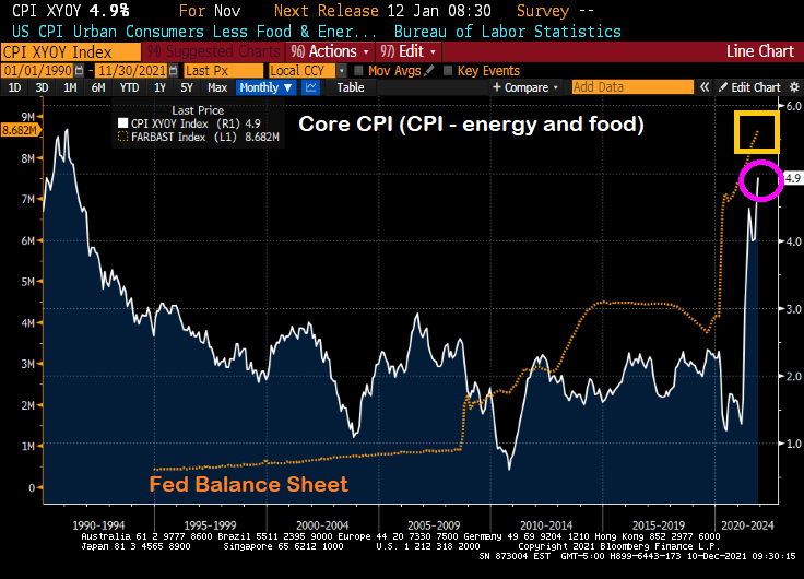 Core inflation (CPI – energy – food) rose to 4.9% YoY, the highest since 1991.