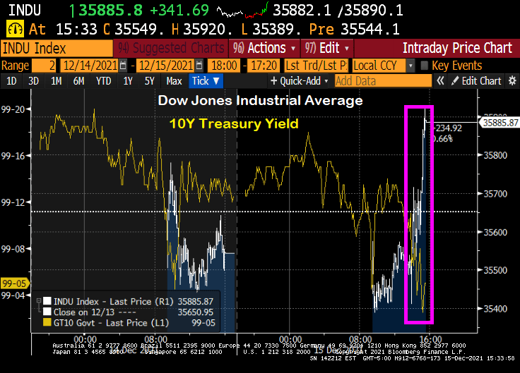 The reaction? The Dow rose 363 points as of 3:36pm EST and the 10-year Treasury yield rose a measly 1.9 bps as markets celebrate The Fed DOING NOTHING TO CURB INFLATION.