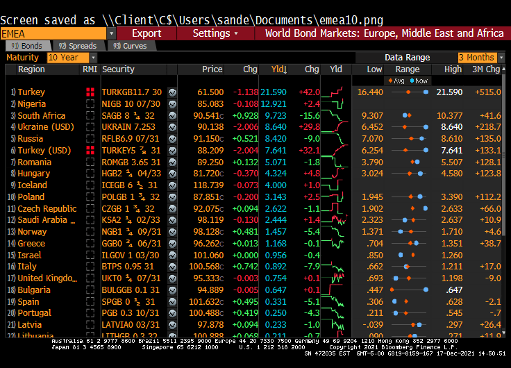Wow. Turkey’s 10-year sovereign yield rose 42 BPS today to 21.590%. Turkey is looking like the Venezuela of Europe and the Middle East.