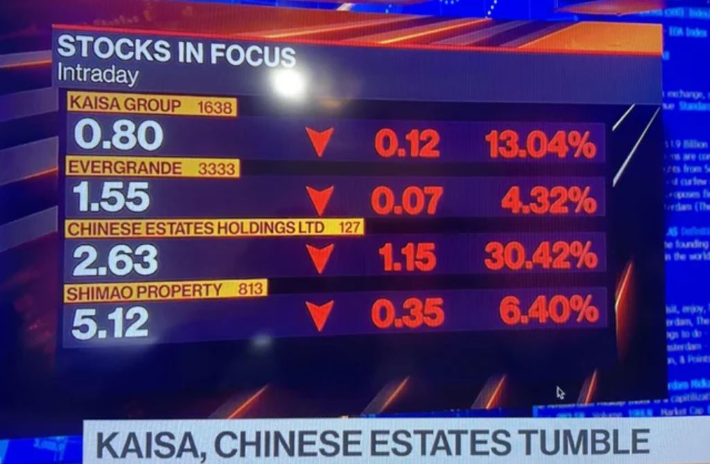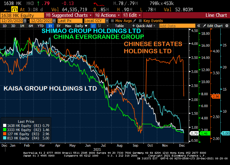 Real estate companies Evergrande, Kaisa, Shimao and Chinese Estates are falling like a rock today.