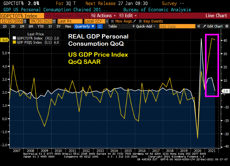The good news is that US Real GDP grew at 2.3% QoQ in Q3 thanks to massive Federal government and Federal Reserve stimulus. The bad news? Prices are growing at rate of 6% QoQ, three times higher than the growth of real personal consumption.