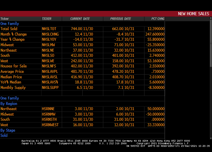 November’s New Home Sales figures are out. New Home Sales declined 14% YoY while the median price of New Home Sales is up 18.8% YoY.