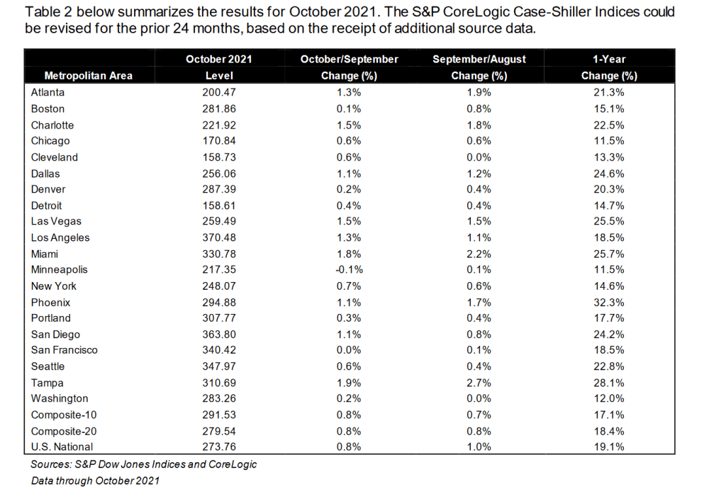 By metro area, Phoenix AZ once again leads with 32.3% YoY. Minneapolis MN is the slowest growing metro area in terms of home prices at 11.5% (tied with Chicago, IL).