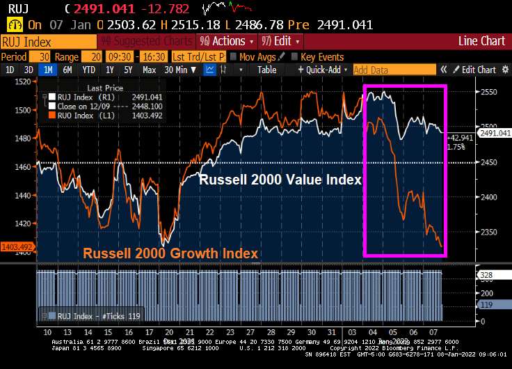 As a result, The Russell 2000 Growth index is plunging (orange line) relative to the Russell 2000 Value index (white line) which is down in 2021.