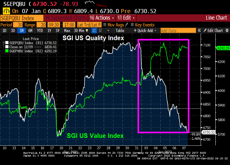 The Société Générale (SGI) US value and “quality” indices are telling the same story. The SGI US “Quality” index is falling like a paralyzed falcon while the SGI US Value index is up for 2022.