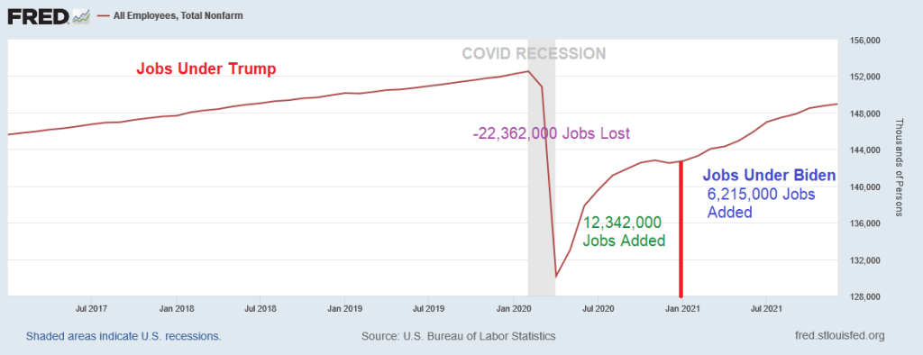 Under his term as President, Biden has benefited from “Snap-back inertia” and saw 6.215 MILLION jobs added in just a year. Pretty impressive, except that it is about half the snap-back effect experienced under Trump.