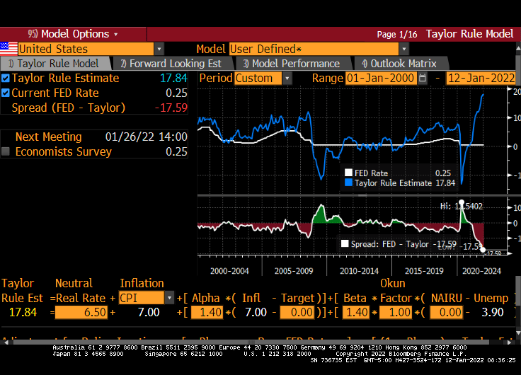 And with 7% inflation, the Taylor Rule model suggests a Fed Funds Target rate of … 17.84%. Bear in mind that the current target rate is 0.25%.