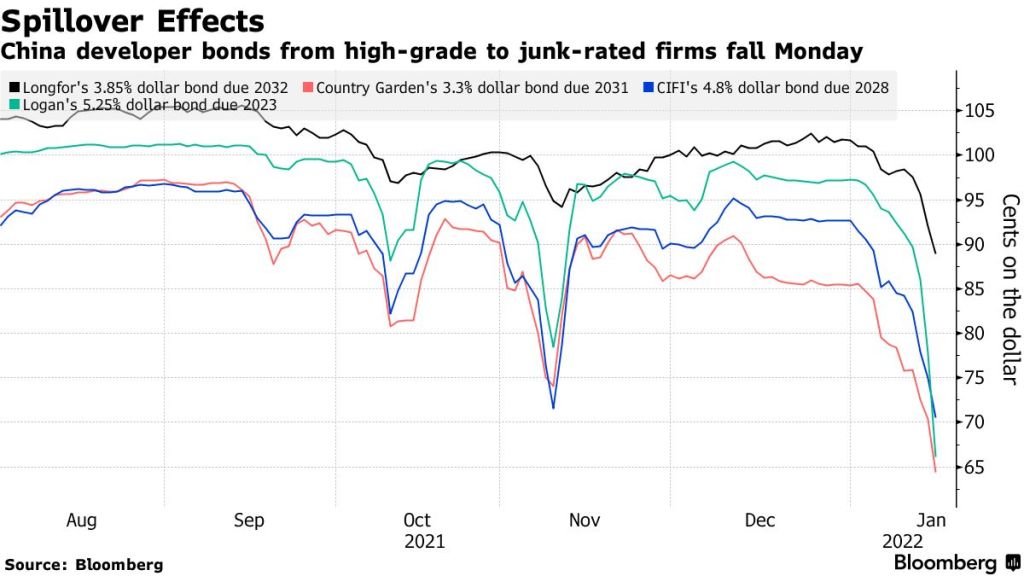 A Logan Group Co. note due 2023 sank 14.1 cents to a record low 62.9 cents after Debtwire reported the developer could be on the hook for $812 million of guarantees on outstanding obligations due through 2023. Country Garden Holdings Co.’s bond due 2024 tumbled 12.9 cents to 67.7 cents, extending last week’s selloff for the country’s biggest developer.