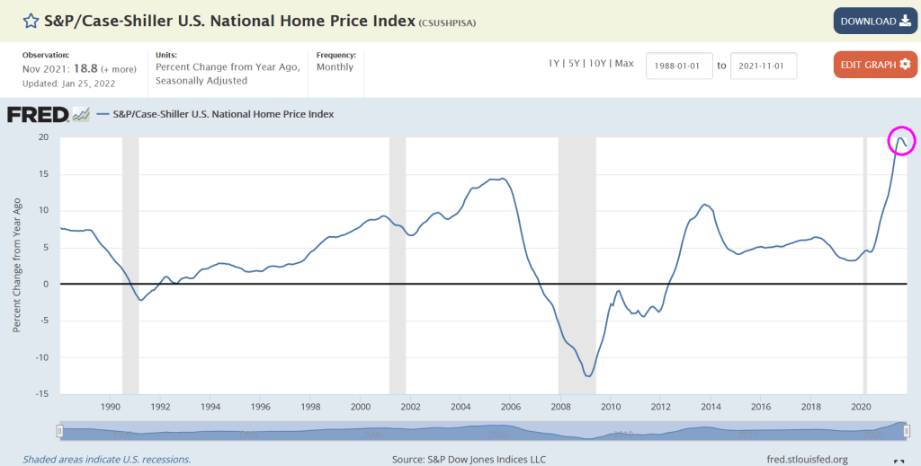 Again, remember that Federal inflation numbers woefully undercount housing and rent inflation. For example, the Case-Shiller National Home Price index (as of November 2021) was growing at 18.8%.
