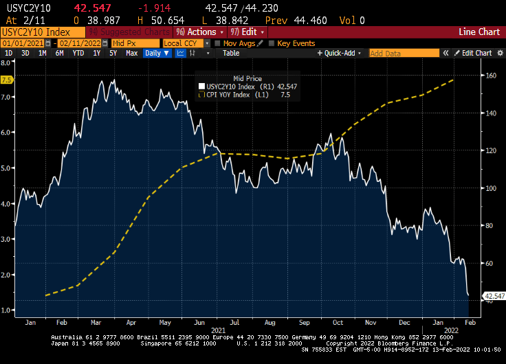 Between raging inflation and the potential wag-the-dog Russian/Ukraine tensions, The Fed has a lot to consider. Particularly if they are watching the 10Y-2Y Treasury yield curve plunging.