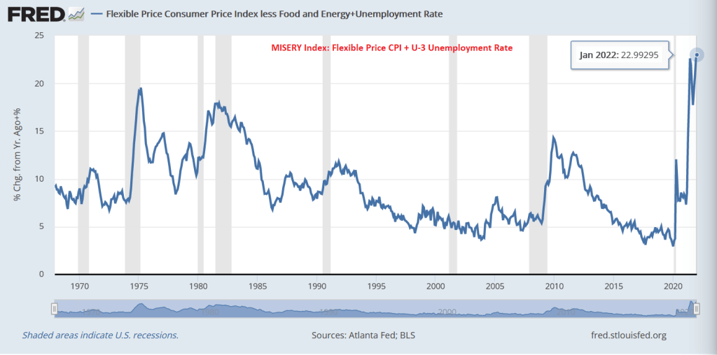 It is truly a miserable time for many Americans as demonstrated by the Misery Index (inflation rate + unemployment rate). But rather than using the CPI YoY measure at 7.5%, I am using the FLEXIBLE CPI YoY to compute the misery index. And is it ever miserable!
