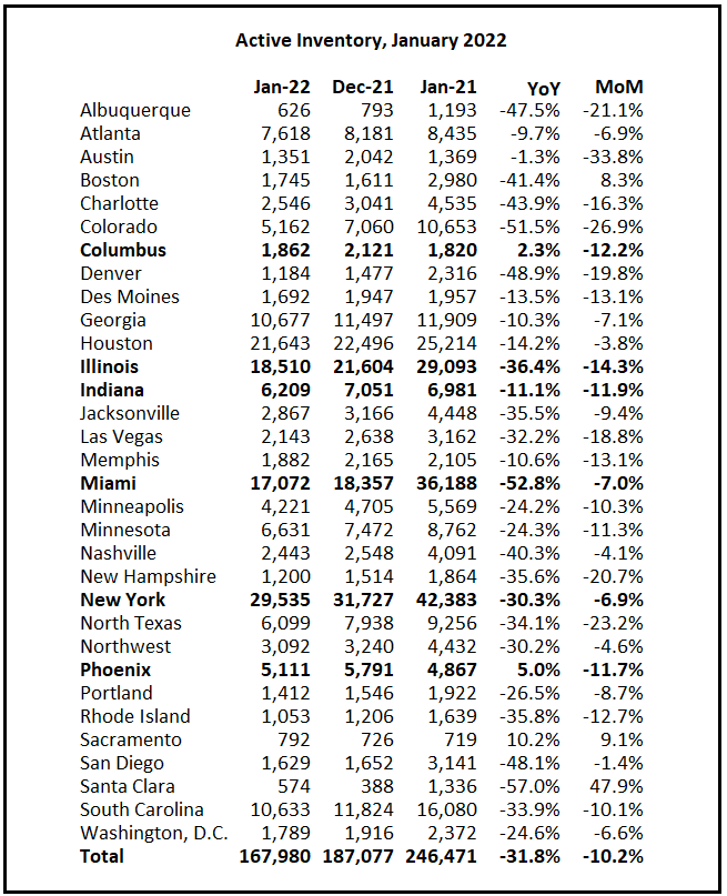 In terms of active inventory of housing, only Phoenix and Columbus Ohio are showing positive growth in active inventory YoY. But even Phoenix and Columbus saw a decline MoM (or month-over-month).