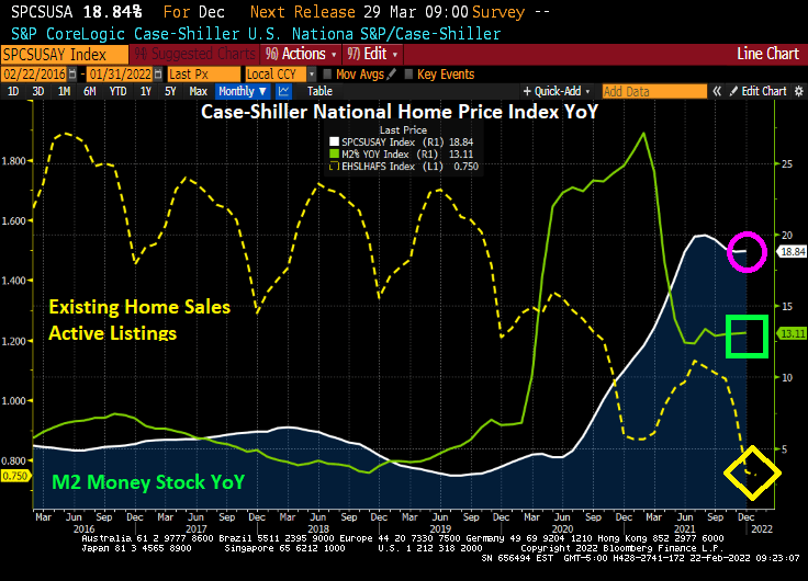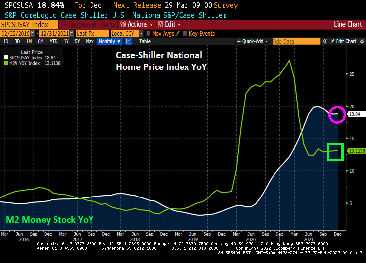 The S&P CoreLogic Case-Shiller National home price index remained HOT in December, growing at a 18.84% pace. M2 Money YoY is still smoking at 13.11%.
