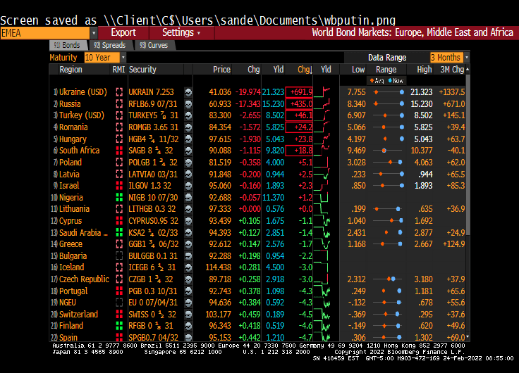 How about the new Russian front? Ukraine’s 10y yield rose 691.0 bps while Russia’s 10Y yield rose 435 bps.