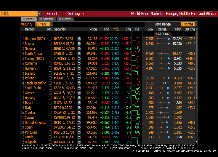 At least US Treasury 10Y yields are down just 7.6 bps. Look at 10Y Russian and Ukraine sovereign yields. Now THAT is a yield surge!