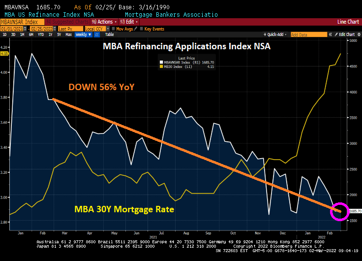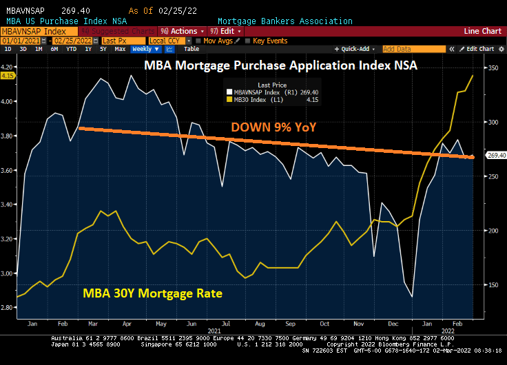 5 thoughts on “Not, Not, Not! Mortgage Purchase Applications Declined 9% YoY For Week Ending February 25, 2022 (Refi Applications Drop 56% YoY)”