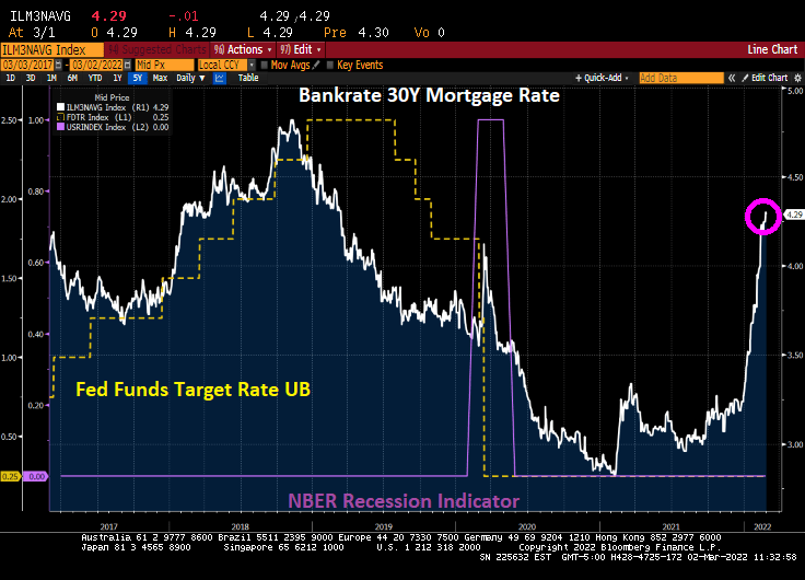 Mortgage rates are down slightly today, but you can see the separation between The Fed’s target rate and the 30-year mortgage rate.