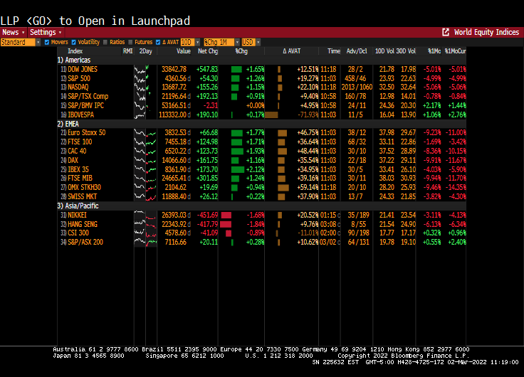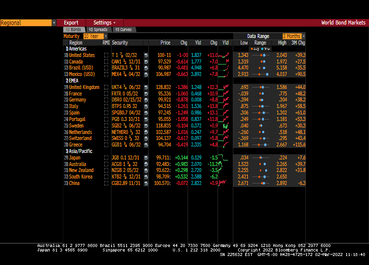 In a broad-based equity rally, financial and industrial companies led gains in the S&P 500. The two-year Treasury yield — which is more sensitive to imminent Federal Reserve policy moves — was near 1.5%. The Fed chief also noted that the central bank is prepared to be more aggressive if inflation is more persistent than expected, while adding that he’s open to “series of rate increases” in 2022. Investors also assessed the latest geopolitical developments, with oil paring gains after earlier topping $110 a barrel.