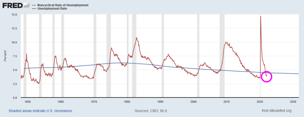But even the latest unemployment rate report (3.8%) is signalling that The Fed should be raising interest rates since it is lower than the Natural Rate of Unemployment or NAIRU (4.44%).