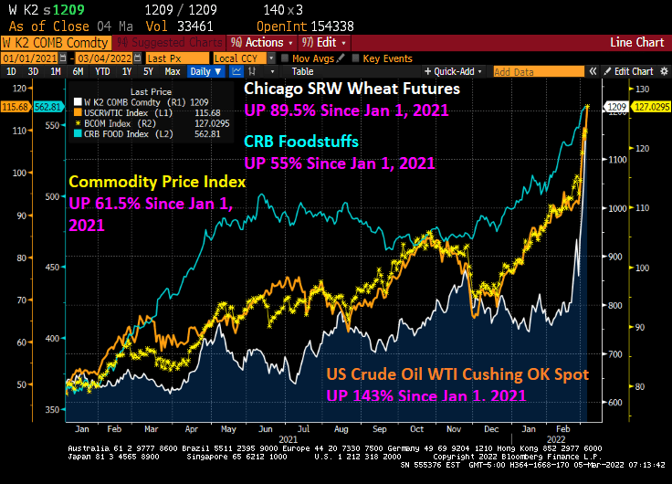 This has been a brutal week for consumers. With the Russia/Ukraine conflict raging and Congress seems determined to not allow for additional oil and gas production, and Biden’s anti-fossil fuel edicts still in place, we are seeing dramatic price increases in wheat (UP 89.5% since January 1, 2021), WTI Crude (UP 143% since January 1, 2021), and food stuffs (UP 55% since January 1, 2021).